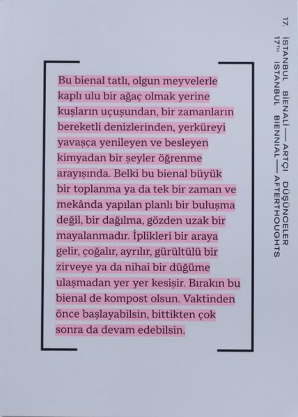 17. İstanbul Bienali'nin bu sergi kataloğu, tarzlarının ve ele aldığı konuların heterojenliğine rağmen, kompostlama dediğimiz, hala devam eden bir sürecin nakaratları ve ahengine dair bir fikir vermek üzere hazırlandı. Kitap doğrusal bir okumayı gerektirmiyor − daha ziyade, bir serginin değil de bir kompostun “elkitabı” veya kullanıcı kılavuzu gibi görebiliriz. Bu bienal için sipariş edilen makaleler ve daha kısa “pozisyon metinleri”nden oluşan ve küçük bir kısmı var olan yayınların içinden seçilmiş olan bu kitap, bienalin kaygılarına ve referanslarına dair daha derin bir bağlam ve teorik düşünceler sunuyor. Büyük oranda görsel formda temsil edilen projeler; bağlantıları, kesişim noktalarını, ortak bağlamları, çoktan yapılmış sohbetler kadar halen devam etmekte olanları da eklemleyen bir bakış açısıyla bir araya geliyor. Bienalin sergi yöneticisi Elif Kamışlı'nın her hafta katılımcılara gönderdiği mektuplardan oluşan seçki, iki yılı aşan hazırlık süreci boyunca, pandemi dolayısıyla ziyaret edilemeyen bir kentin genellikle gergin olan ruh halindeki değişimleri, ulusal olmanın çok ötesinde, aynı zamanda kentsel ve son derece kişisel olan bir huzursuzluğun tarihini kayda geçiriyor. Kataloğun tasarımı Emre Çıkınoğlu'na ait. Yayın Fikri: Amar Kanwar, Ute Meta Bauer, David Teh Yayıma Hazırlayanlar: Umud K. Dalgıç, David Teh, Ute Meta Bauer Yayın Asistanları: Soh Kay Min, Eylül Zeynep Belden Metinler: Nabil Ahmed, Nirwan Ahmad Arsuka, John Bell, Rustom Bharucha, Çiğdem Buğdaycı, Övül Ö. Durmuşoğlu, Greg Dvorak, David Harvey, Elif Kamışlı, Amar Kanwar, Michael Marder, Ruth McDougall, Carl Mika, Zozan Pehlivan, Maria Puig de la Bellacasa, David Teh Çeviri: Erdem İlgi Akter, Ömer B. Albayrak, Münevver Çelik, Nazım Hikmet Richard Dikbaş, Süreyya Evren, Emrah Irzık, Gökdemir İhsan, Begüm Kovulmaz, Sinem Özer, Melis Şeyhun Tasarım ve Sanat Yönetimi: Emre Çıkınoğlu Tasarım Asistanı: Hatice Çavdar