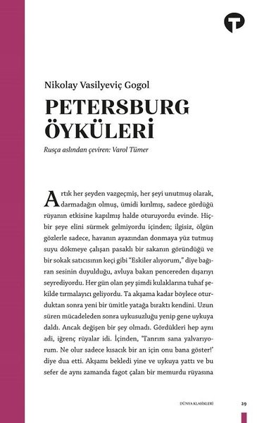 Petersburg Öyküleri adlı bu kitapta büyük Rus edebiyatçının “Neva Bulvarı”, “Burun”,
