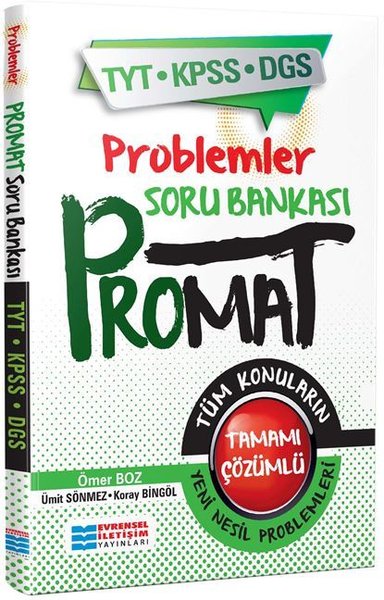 Promat Problemler Soru Bankası-TYT-KPSS-DGS adlı kitap, içeriği bakımından çok kapsamlı soru kalıplarına sahip. Sınavlara hazırlık aşamasının her anında yanınızda olacak olan bu kitap ile hayallerinize doğru bir adım atabilirsiniz. Bu kitabı her yere yanınızda götürebilir ve zamandan tasarruf edebilirsiniz. Verimli ve disiplinli bir çalışma ile soru çözme kabiliyetinizi artırabilirsiniz. Problem çözme yeteneği üzerinde duran soru bankası; TYT, KPSS ve DGS adayları için yetkin bir çalışma serüveni sunar. Problemlerle ilgili soruları zorlanmadan çözmek, diğer konulardaki soruları kolaylıkla çözmenize de yardımcı olur. Bu kitap sayesinde KPSS, DGS, TYT gibi sınavlarda başarı olasılığınızı arttırabilir; geleceğinize ışık tutabilirsiniz. Kaynağın içerisinde bulunan yeni nesil sorularla birden çok kazanıma sahip olabilir, bu kazanımları kalıcı hâle getirebilirsiniz. Soruların tamamının çözümleri ile verilmesi, arada kaldığınız ya da yanıldığınız durumlarda size yol gösterir. Bu yönüyle hem yeni çözüm teknikleri öğrenmenize hem eksik hissettiğiniz konuları tekrar gözden geçirmenize ve daha kalıcı bir şekilde öğrenmenize fırsat verir. Promat Problemler Soru Bankası-TYT-KPSS-DGS, akıllı tahtaya uyumludur. Bu özelliğiyle sınıf ortamında da rahatlıkla kullanılabilir. Hem öğrenciler hem öğretmenler için faydalı bir yardımcı kitap olan Promat Problemler Soru Bankası-TYT-KPSS-DGS, sınava hazırlık sürecinizde farklı zorluk seviyelerinden sorularla sizi geliştirebilir. 340 sayfadan oluşan Promat Problemler Soru Bankası-TYT-KPSS-DGS; Koray Bingöl, Ömer Boz ve Ümit Sönmez' in deneyimli kalemleri ile hazırlanır ve Evrensel İletişim Yayınları tarafından yayımlanır.