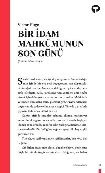Bir başucu kitabı. Victor Hugo'nun 27 yaşındayken takma adla yayımladığı bu küçük kitabı Dostoyevski, "eşsiz bir başyapıt" olarak nitelendirmişti. Gerçekten de çağının siyasi ve sosyolojik yapısına sert bir eleştiri niteliği taşıyan Bir İdam Mahkûmunun Son Günü'nde Hugo okura olayları tek bir karakterin zihninde dolaşarak aktarıyor ve bu anlamda modernist bilinçakışı tekniğinin habercilerinden oluyor.